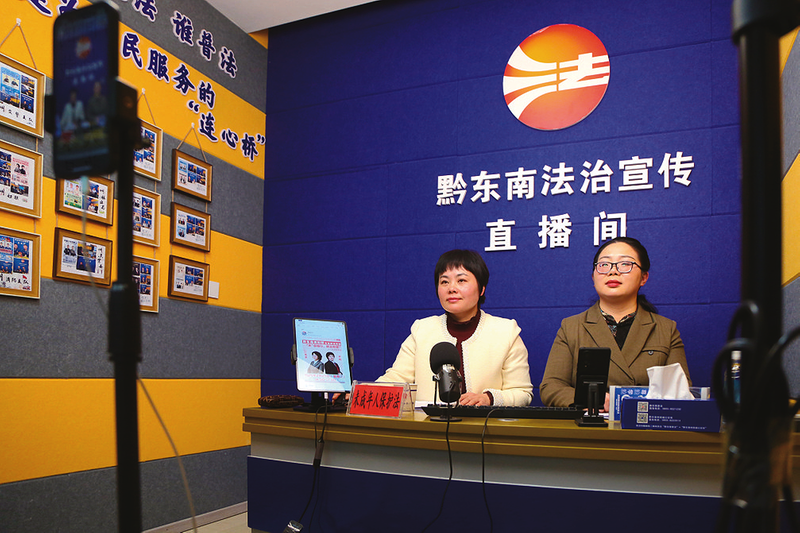 图为法治副校长团队成员到黔东南法治宣传直播间向网民普法。