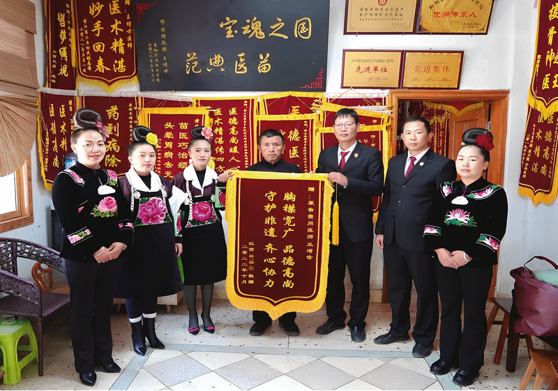 图为苗医药非遗代表性传承人被侵权案中,被告委托法院向原告赠送锦旗。