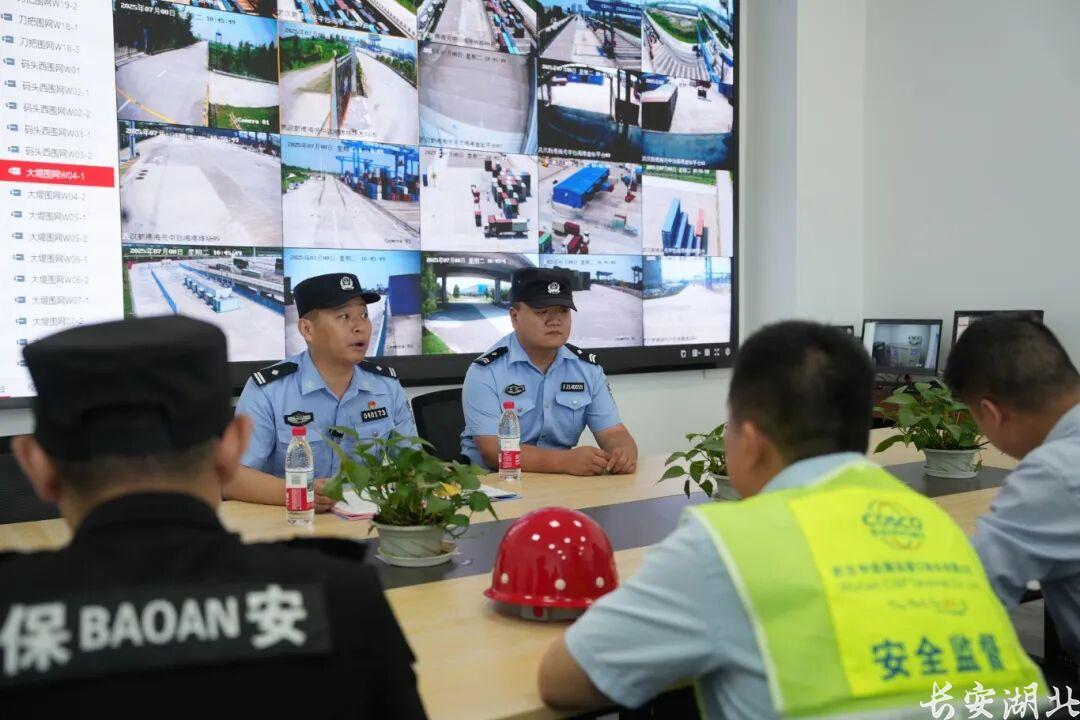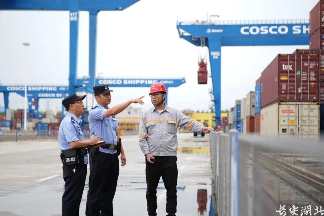 就在这繁忙的物流画卷中,湖北省武汉市公安局武汉长江新区分局余集派出所民警钟珩正和厂区安检人员正在集装箱堆场巡逻,“港区24小时连轴转,我们的守护也得跟得上,要让每一批‘出海出境’的货物都走得安全、走得顺畅。”