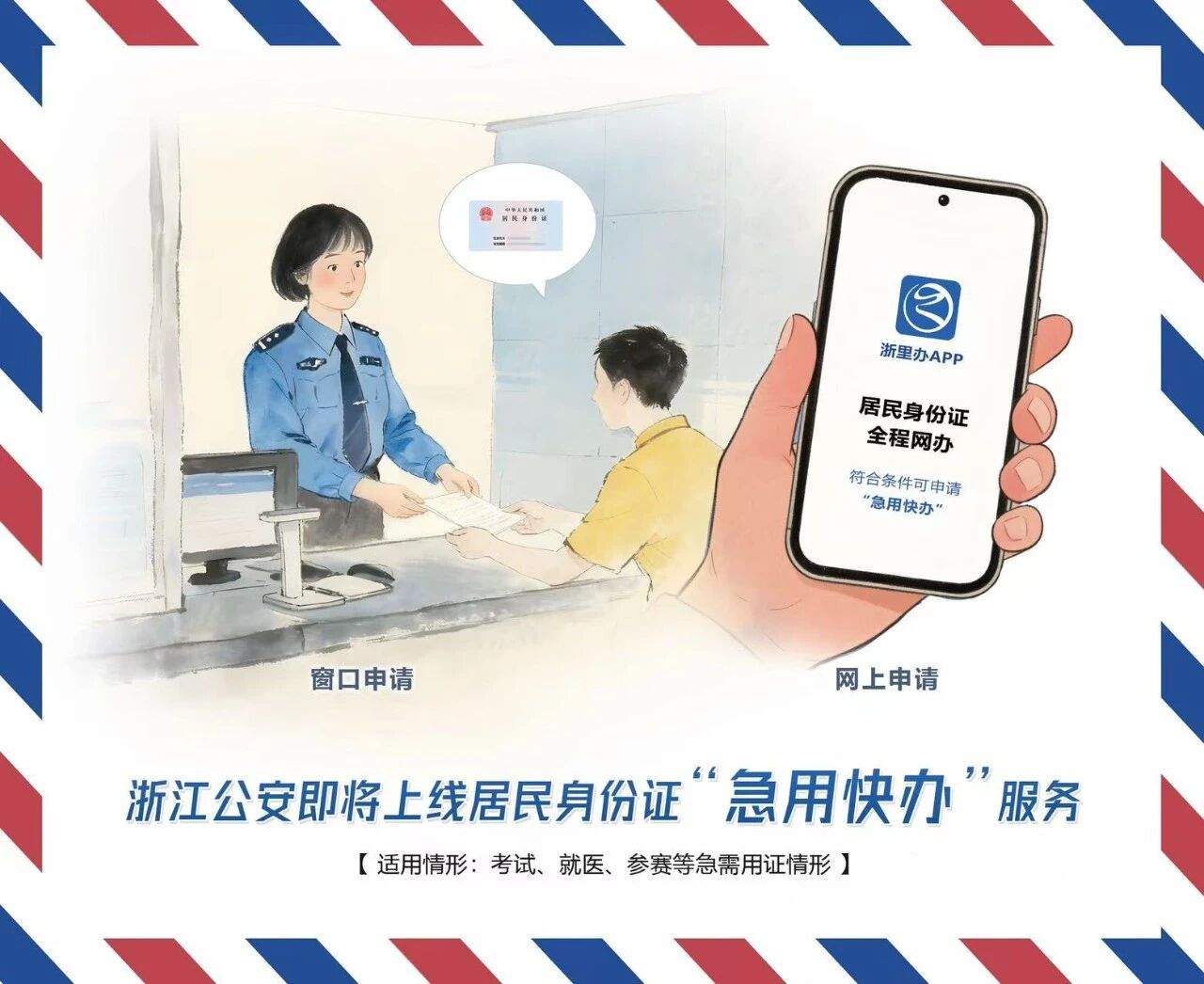 11月28日,记者从省公安厅居民身份证制作中心获悉,自12月1日起,居民身份证“急用快办”服务将在“浙里办”APP正式上线。该服务着力破解群众在考试、参赛、省外就医等特殊情况下的用证燃眉之急,申请后3至5个工作日即可领证,切实便民利民。