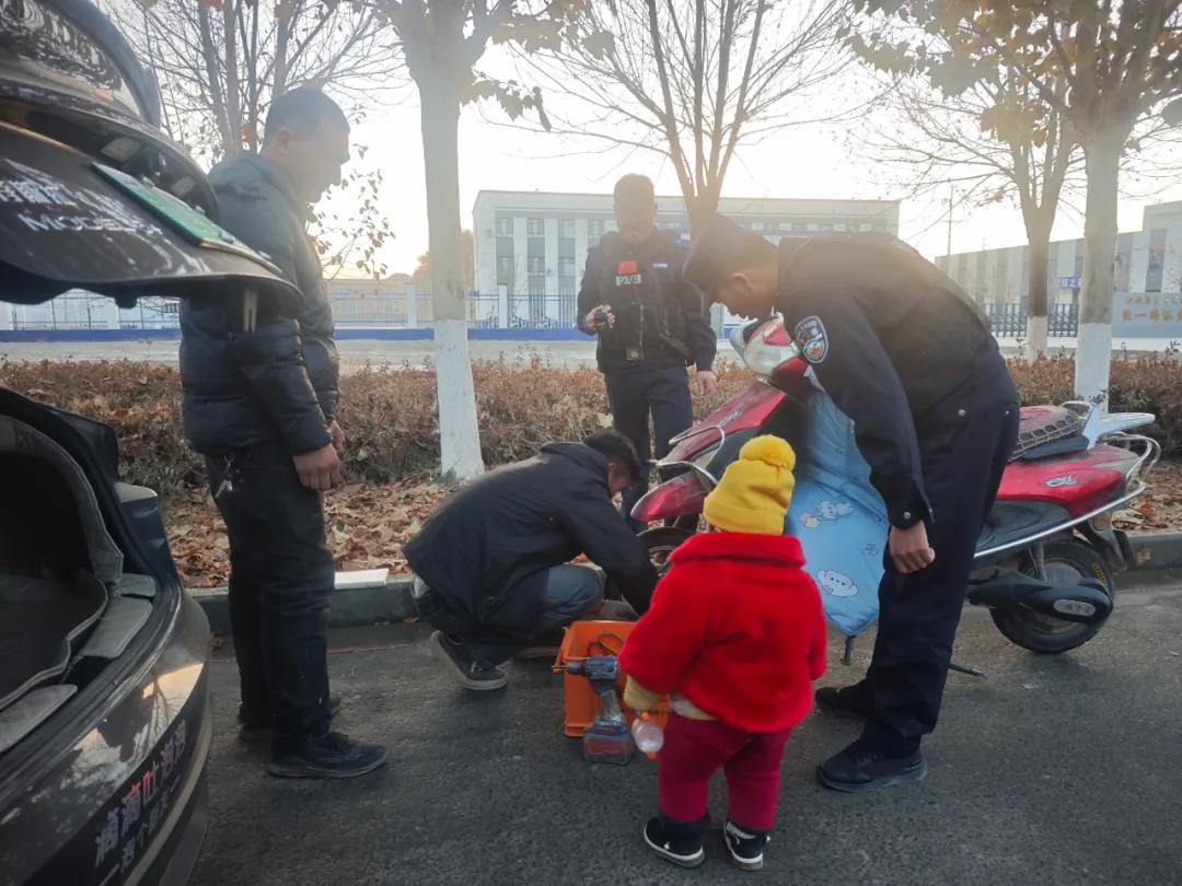 巡逻组民辅警帮着看了看车,发现前轮外胎裂了个大口子,内胎八成废了,赶紧打电话叫师傅帮忙修理。“咱们去派出所先坐一会,带着娃娃去暖一暖!”“老婆也没跟我生气,警察也帮我们,今天这是在阿拉尔最高兴的一次!”在派出所等待时,艾尼瓦尔看着醒来的孩子拿着一颗桔子蹦蹦跳跳,散尽了一脸的愁容。