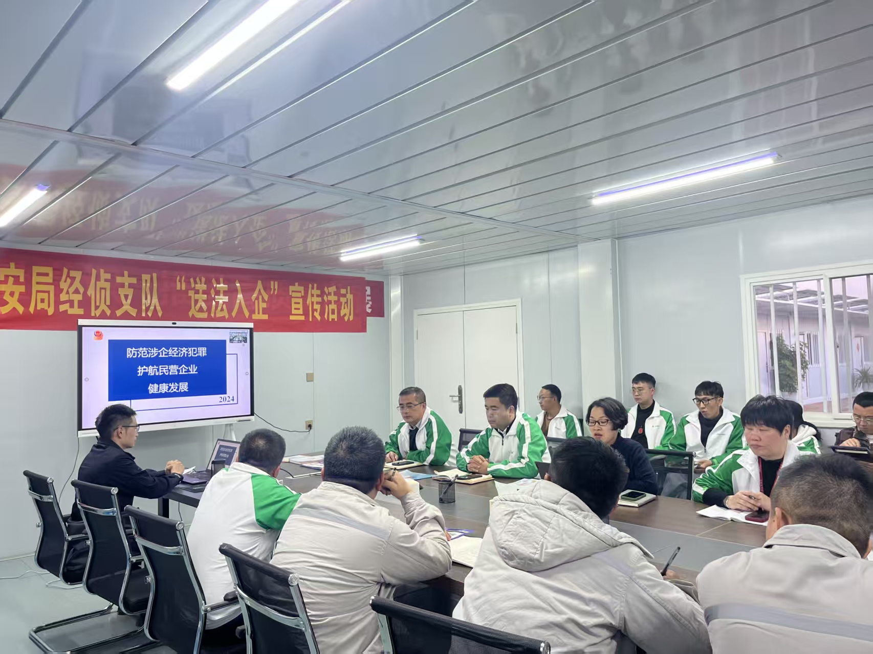 在经开区德方纳米公司,经侦支队民警开展“送法入企”活动,以“防范涉企经济犯罪护航民营企业健康发展”为主题,对到场员工进行宣讲。