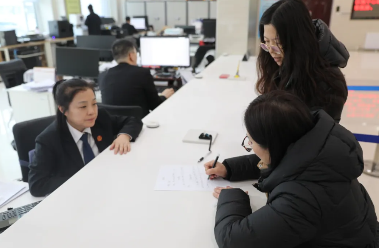 一位大姐在便民服务区里奋笔疾书,却在填写被告信息时猛地停笔,抓耳挠腮,被路过的一位干警发现并指引其来到台前操作。填写申请表、交给法官,再由法官向派出所提交《查询函》,被告的信息同步到内网进行立案,既帮助原告,又保护被告。