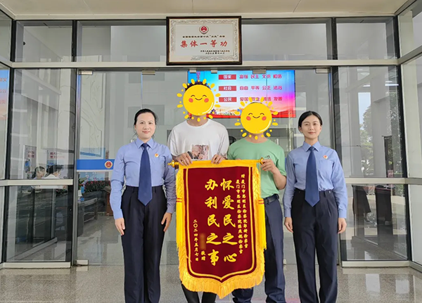 涉罪未成年人及其父亲专程来到厦门市思明区检察院,向检察官送来一面锦旗