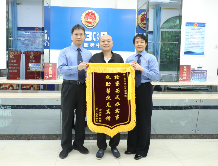 廖梦等检察官为了帮助他解决生活上的困难,多方沟通联络,想方设法解决了他的生活问题,让他特别感动。他真的没有想到,一个身处异地的打工者,在他乡遇到困境时,白沙检察院伸出援手,既能为他维权,还能解决他的生活所困。所以,为表谢意,他特意写了一封感谢信,并专门制作了一面锦旗,专程送到白沙检察院。