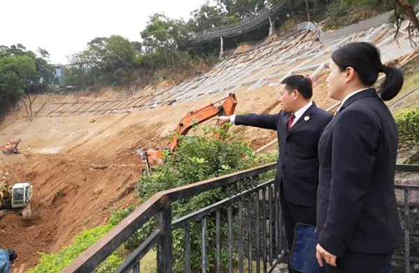 2024年3月,鼓楼区检察院通过“益心为公”平台收到一条紧急线索。检察官刘柳青立即赶赴现场,眼前景象令她心头一紧:巨大山体裂缝横亘眼前,不仅威胁小区居民安全,也危及“福道”景观与结构。应邀前来现场的地质专家指着滑坡断面严肃警告:“裂缝超29米,必须立即治理!”
