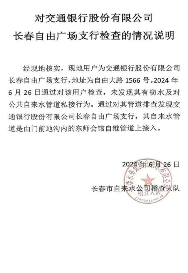 2024年6月,东师会馆正式发现盗水行为后,立即向长春市自来水公司稽查大队报案。稽查人员实地核查确认,“交行吉林分行自来水管道由东师会馆自维管道接入”,且东师会馆维修消防管道时,交行同步停水,进一步印证盗水事实。