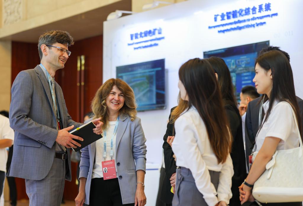 7月11日,参会嘉宾在2025上合组织数字经济论坛互动体验区与参展企业工作人员交流。新华社记者 孙凡越 摄