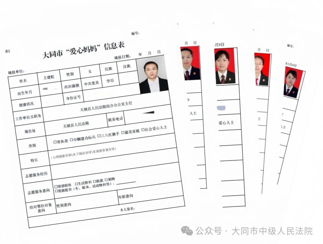 姓名:王建虹,性别:女,民族:汉族,出生年月:1986年04月,政治面貌:中共党员,工作单位及职务:天镇县人民法院综合办公室主任,特长:心理健康咨询、亲子阅读指导、家庭教育服务,志愿服务意向:情感联络、生活照料、捐款、捐物、资源提供……5张信息表登记入册以后,正式宣告5名干警成为“爱心妈妈”。