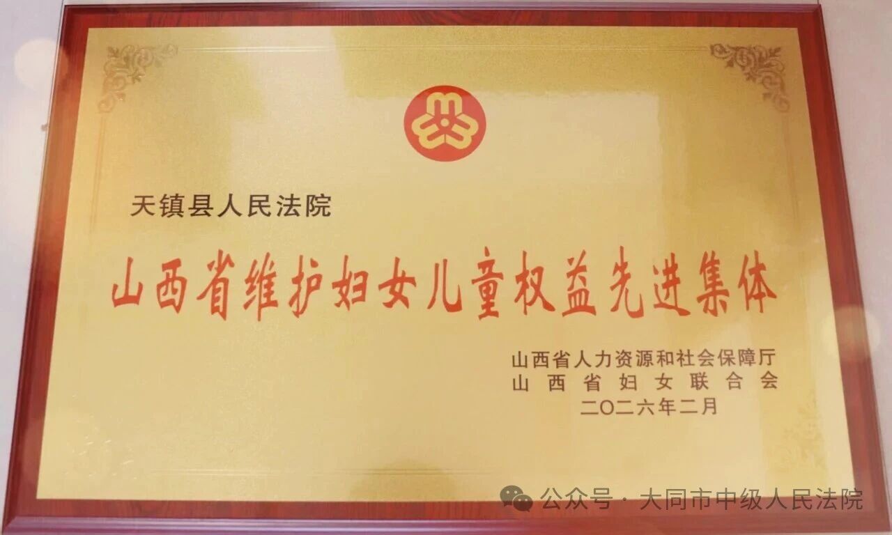 天镇法院获评“山西省维护妇女儿童权益先进集体”