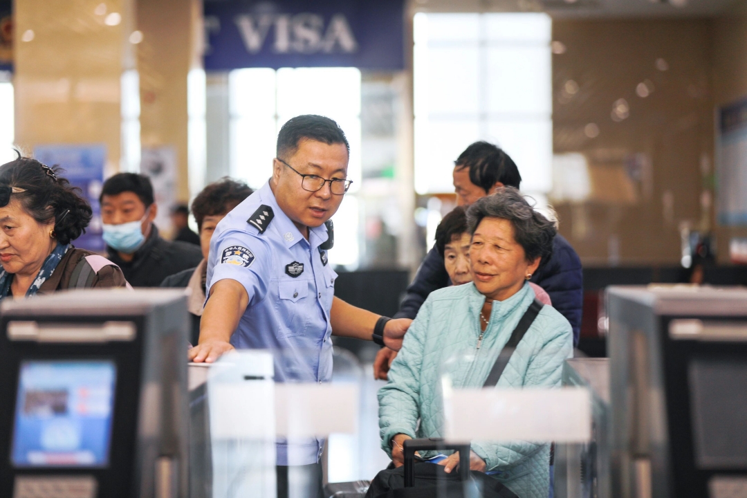 2025年9月8日,二连出入境边防检查站民警协助老年旅客办理通关手续