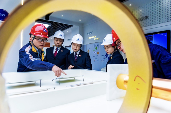 近日,湖北省黄石市下陆区检察院检察官深入辖区企业开展走访调研。近年来,该院聚焦法治化营商环境建设,通过实地走访、问卷调查等多种方式,广泛收集工商界与企业对检察工作的意见建议,以法治力量护航企业长远健康发展。图为该院检察官向工作人员了解企业发展情况及法治需求。